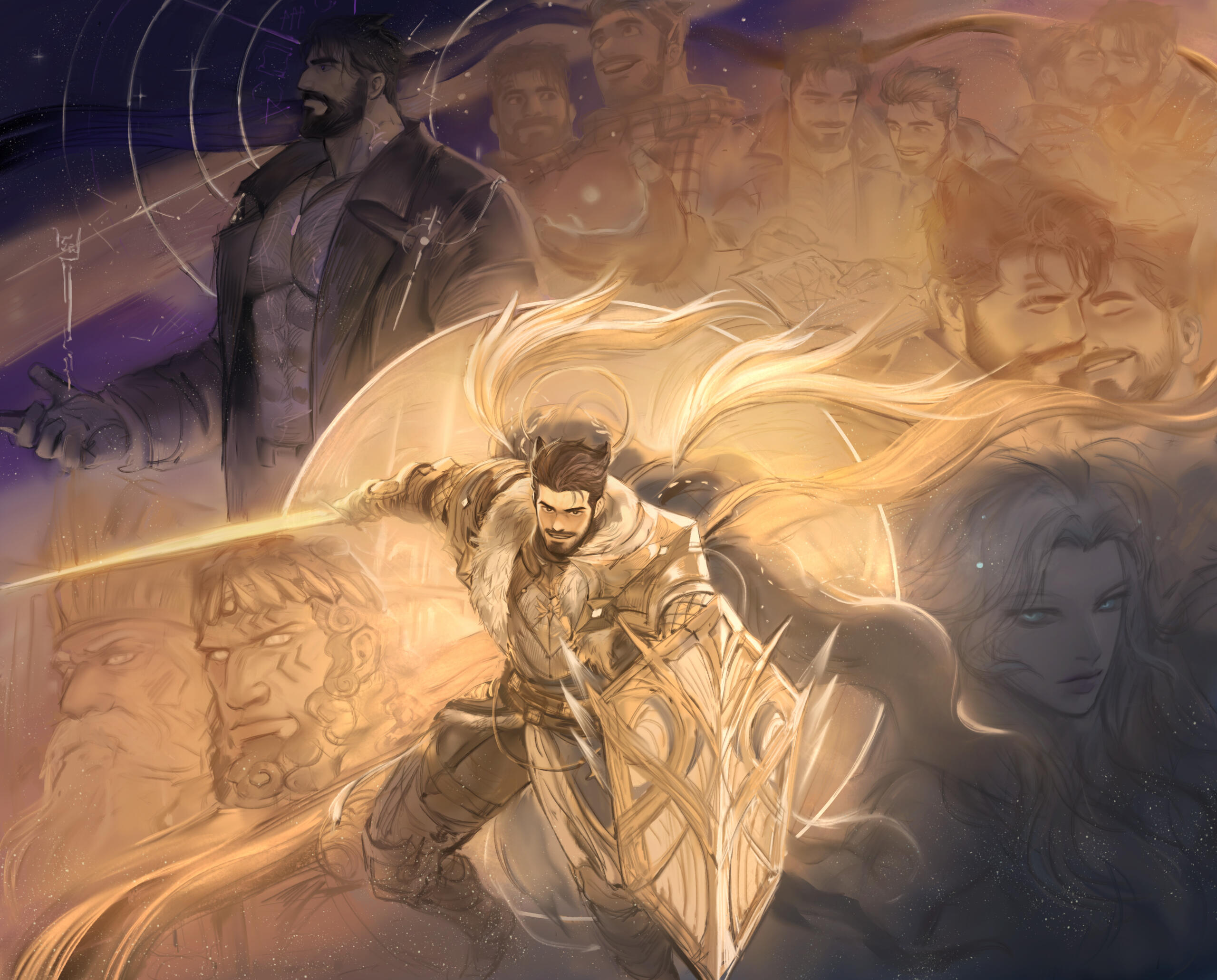That’s about when Leander showed up. Some arcane investigator from gods-know-where, poking around in old glyphs and void-touched nonsense with all the subtlety of a glamoured chocobo in a library. Thordar got dragged into it when a few overzealous knights tried to detain the guy over a permit they couldn’t read. He read it for them, told them off, and ended up stuck with Leander for the rest of the night. One thing led to another—banter, shared drinks, suspiciously long glances, and just enough charm to be dangerous. Then kissing. Lots of that.They've been more or less inseparable since—Leander pulling Thordar into his investigations “just for muscle,” and Thordar pretending not to enjoy the puzzle-solving part—or being able to wear his flashy armor again. Whether it’s hauling cursed tomes, warding off stray voidsent, or deciphering old glyphs with a paladin's eye, the two make a surprisingly efficient team. Or at least an entertaining one.